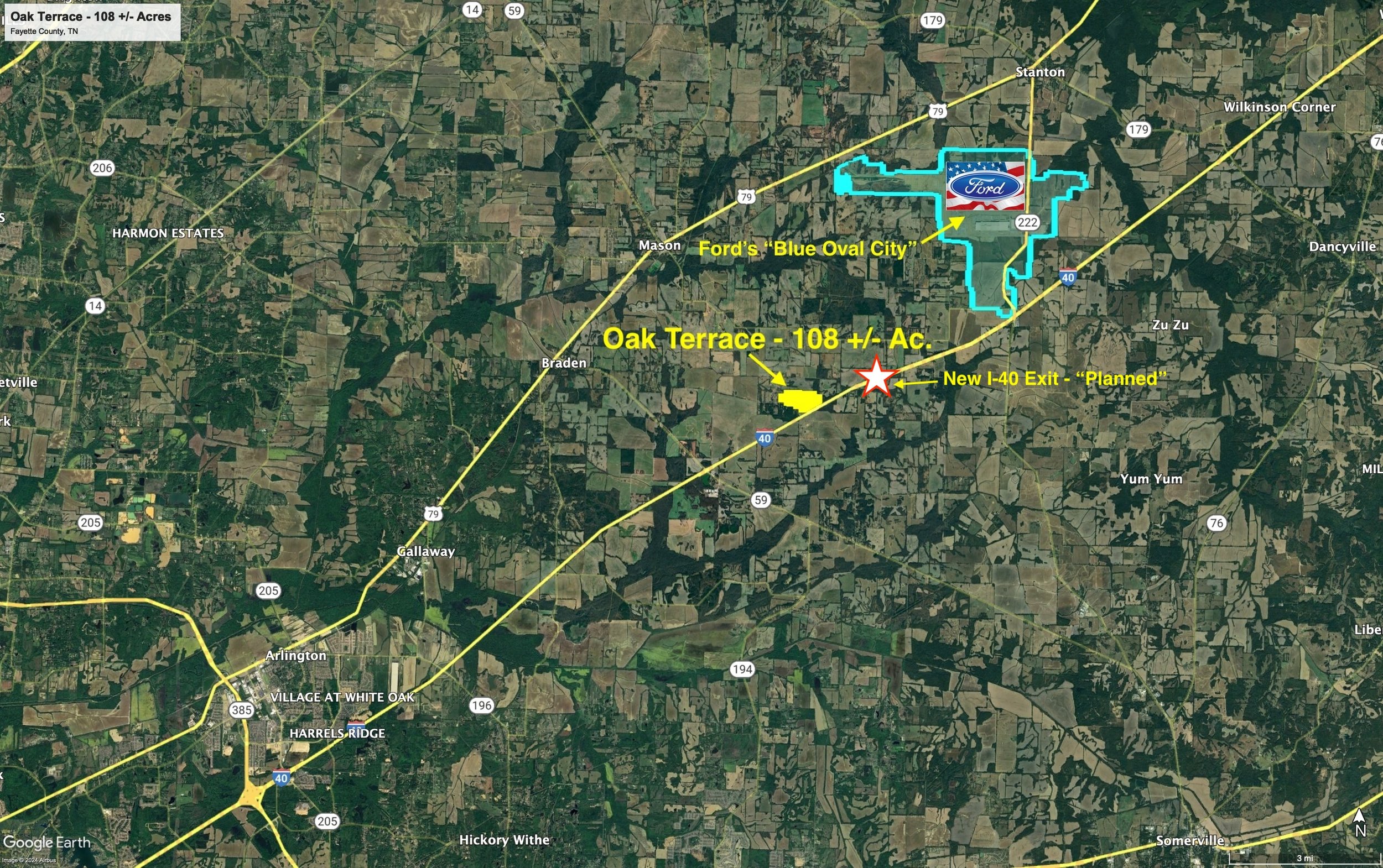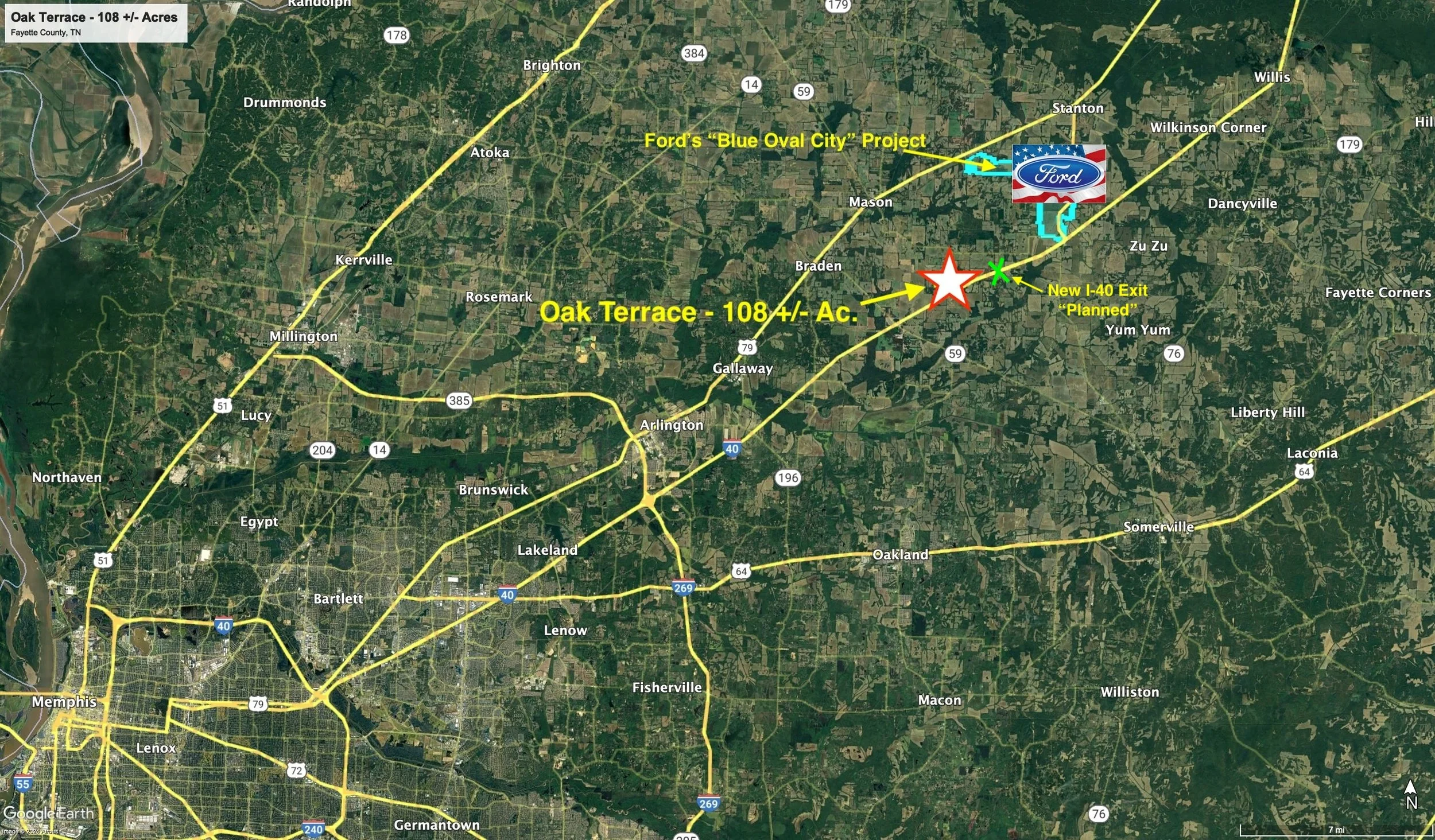 For investors, today it would be possible to subdivide the property into 7+ parcels “by right’ along the existing Sinai Rd. frontage. Additionally, it would be compelling to wait for the new I-40 Interchange of Hwy 194 which will be 1.0 mile east of the property. This new interchange should improve access to the property and will likely bring many new developments to the area. In summary, Oak Terrace is positioned well to benefit from the Blue Oval City Development and related projects, as well as the advancing growth east from the Memphis Area.