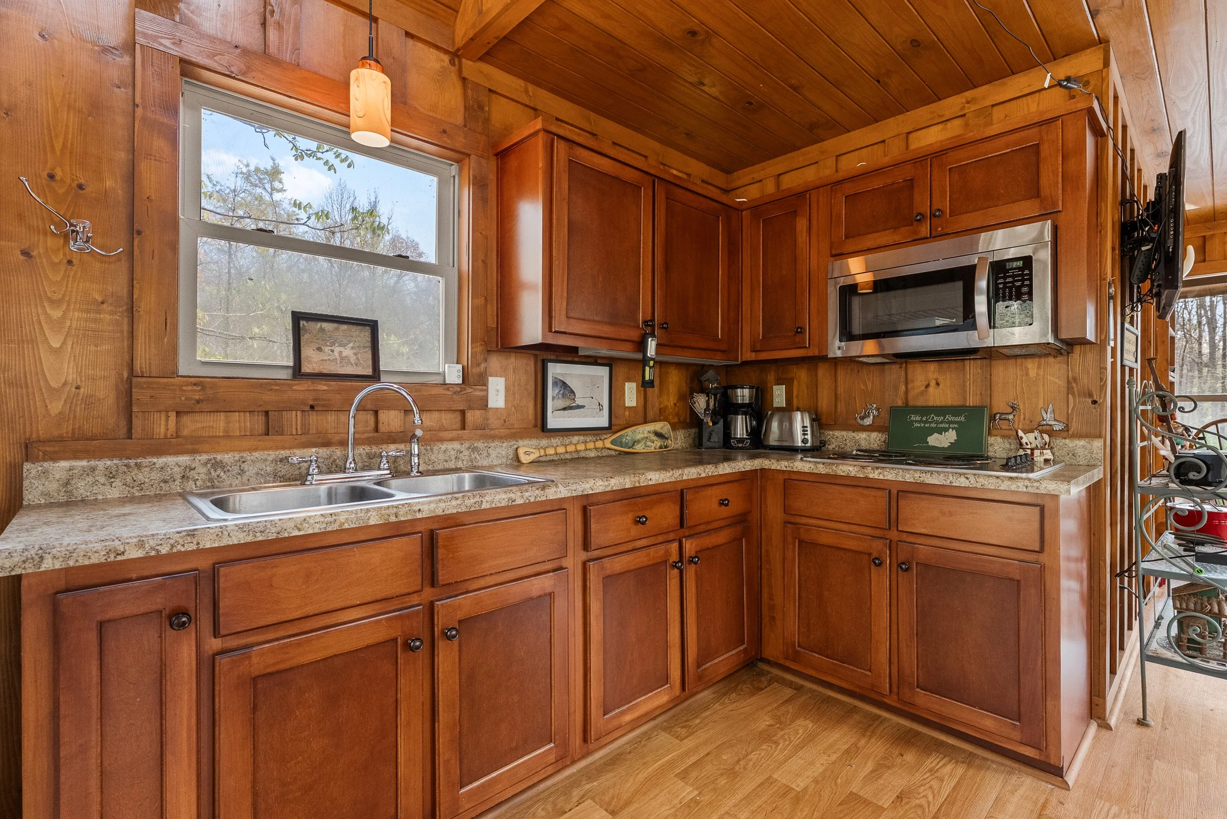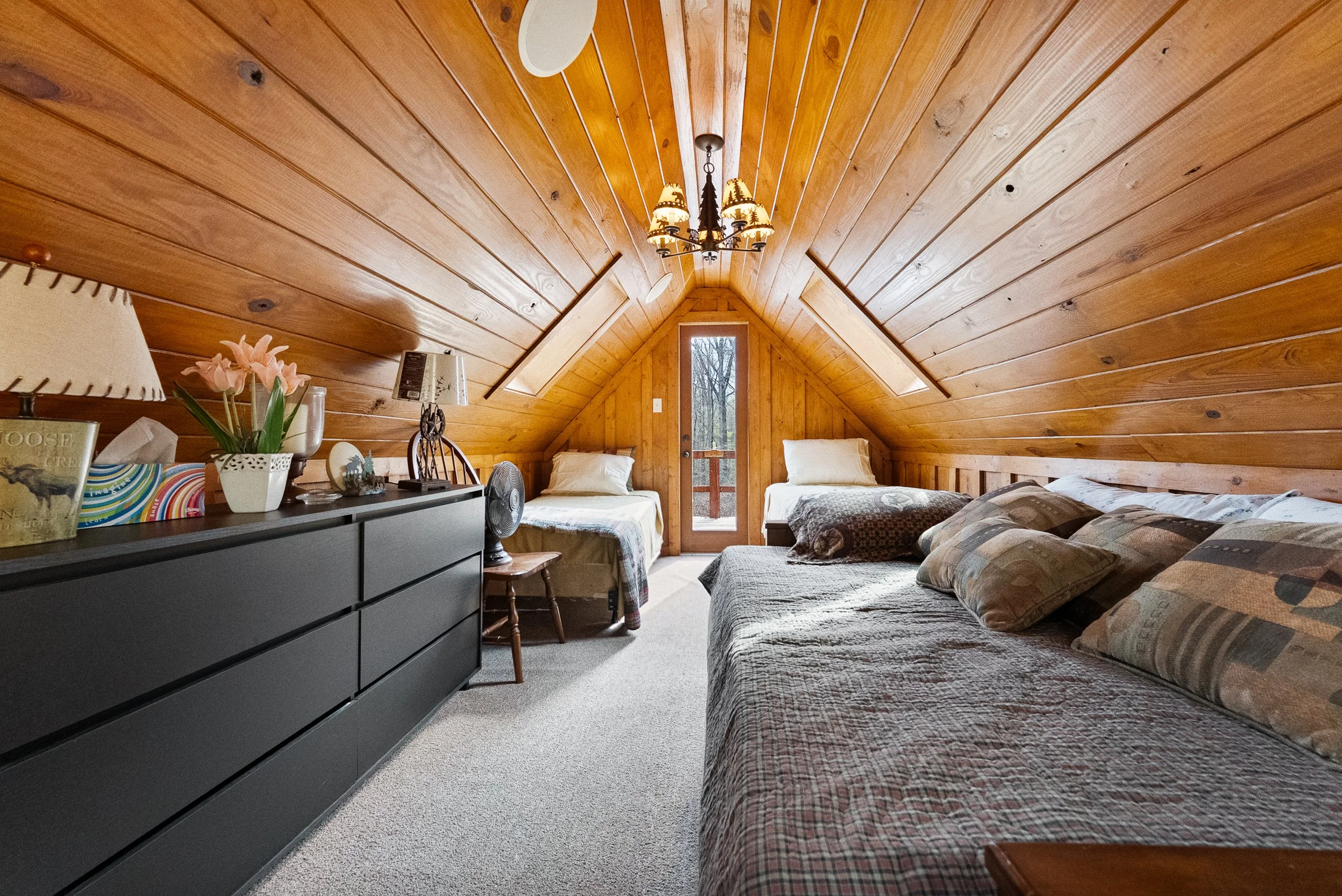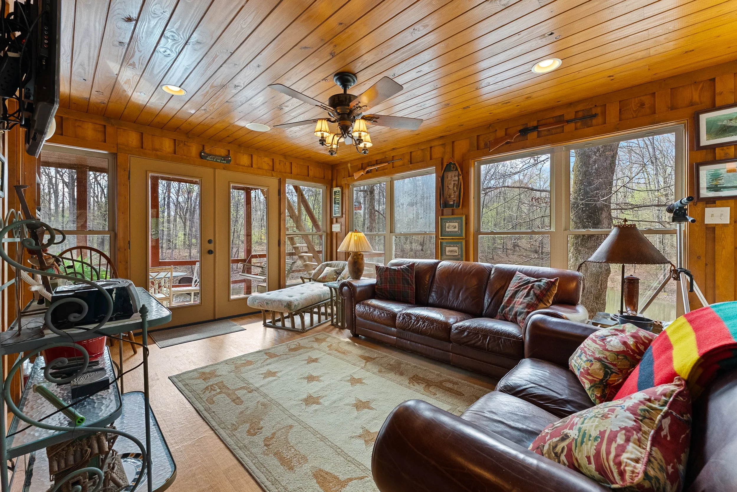 Just beyond the home’s rear patio, a network of winding woodland trails invites exploration, extending roughly a mile through some of the region’s most picturesque hardwood forest. One trail leads to a secluded lake, where a charming treehouse-style retreat—known as Lost Valley Lodge—awaits. Overlooking tranquil waters, the lodge features a cozy living area, full kitchen, and sleeping loft, while its porches offers the perfect setting to relax, read, and take in the natural beauty of creation in panorama!